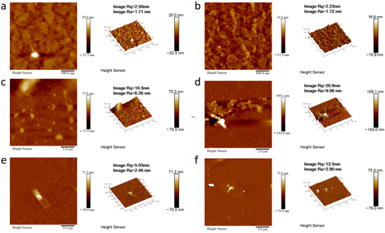 AFM height images of ITO/2M-DDF with different multiples ((a): 400 nm, (b): 600 nm, (c): 1 μm, (d): 2 μm, (e): 3 μm, (f): 4 μm).