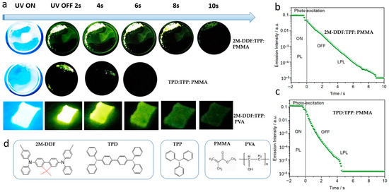(a) LPL photographs under ambient conditions of 2M-DDF:TPP:PMMA, TPD:TPP:PMMA, and 2M-DDF:TPP:PVA (excitation: 365 nm). The semi-logarithmic plot of the emission decay profile of the 2M-DDF:TPP:PMMA (b) and TPD:TPP:PMMA (c) from −2 s to 10 s, which exhibited photoluminescence (PL) upon photo-excitation (from −2 s to 0 s) and LPL after the excitation turned off (excitation wavelength: 365 nm; excitation power: 10 mW; excitation time: 2 s; sample temperature: 300 K). (d) Chemical structure of 2M-DDF, TPD, TPP, PMMA, and PVA.