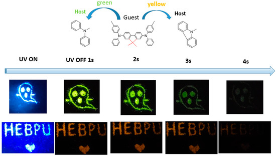 To further expand the application field of the proposed materials, we doped crystal materials with different hosts of different sizes, preparing multi-color tunable afterglow materials in a rigid crystal-mode environment. When diphenylamine (DPA) and CA host materials were doped with 2M-DDF guest molecules (forming doped crystalline 2M-DDF: DPA), we were delighted to observe a deep yellow afterglow for 3 s and a deep green afterglow for 3.4 s under 365 nm ultraviolet excitation (see Figure 7). Such multi-color tunable afterglow materials can potentially be prepared as anti-counterfeiting materials with high encryption degrees.