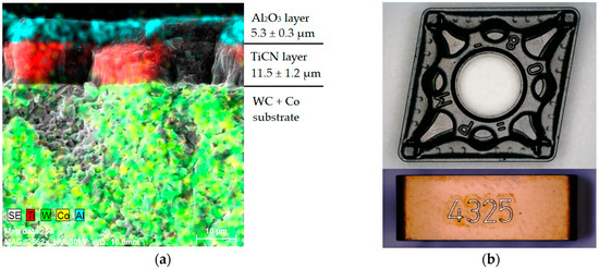 Figure 2. Investigated CNMG 120408E-MP3 WPP20S cutting insert: (a) composition of deposited coating layers; (b) macro shot of functional surfaces.