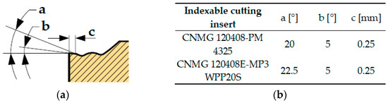 Investigated chamfering structure parameters of evaluated cutting inserts: (a) schematic visualisation; (b) values for each cutting insert.