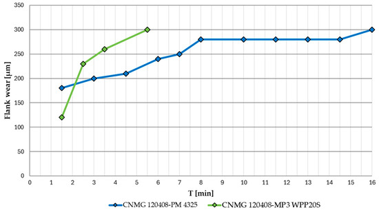 Figure 5 shows the wear progression of the two cutting inserts examined during the machining of AISI 4337 steel. The CNMG 120408-PM 4325 insert reached the tool life of the cutting edge, i.e., the specified critical wear at T = 16 [min]. The CNMG 120408-MP3 WPP20S insert reached approximately one-third of the tool life of the cutting edge at T = 5.5 [min]. For both inserts, an initial slowing trend in the wear progression is visible.