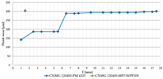 The same analysis of the wear progression of the evaluated cutting inserts was conducted using the test material AISI 316 L. Figure 6 shows the wear progression of the CNMG 120408-PM 4325 insert, which reached the specified critical wear at time T = 17.3 [min], which was 1.3 minutes longer than with AISI 4337 material. The CNMG 120408-MP3 WPP20S insert reached critical wear at T = 1.5 [min], practically right after the first cut.