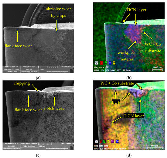 The wear patterns of the main flank face of the CNMG 120408-MP3 WPP20S insert after machining of AISI 4337 steel and the elemental analysis of the worn surfaces are shown in Figure 9a,b. The flank face wear and abrasive wear by chips are clearly visible and are defined with an exposed TiCN layer, locally adhered workpiece material (chips) and even partially exposed support substrate. The wear rate is therefore higher than in the case of flank face wear. In Figure 9c, after the machining of ASIS 316 L steel, chipping, flank face wear and notch wear can be seen at the interface between the cutting edge and the workpiece surface. In Figure 9d, EDX analysis confirms a more intense level of wear at the level of the TiCN layer in the area of the tip of the tool, and the substrate level in the notch wear area, which was partially filled by the workpiece material in the form of BUE. BUE is mainly observed at the areas where the underlying coating layers or substrate material have been exposed. Again, after machining AISI 316 L, the BUE was more extensive due to more intense wear at the level of the substrate.
