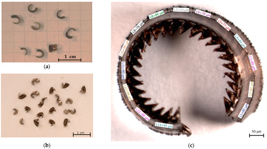 The experiment also included an analysis of the produced chips in terms of their length and shape. The resulting chronologically arranged photographic documentation of the chips provided the basis for the assessment of the shape of the chips (see Figure 11a,b), and also for the measurement of the length of the chips, which was carried out using the micrometric method (see Figure 11c). As part of the shape assessment, 5 to 15 chips were assessed per chip collection for each workpiece material removal. Length measurements were made on 3 to 5 pieces per each chip collection.