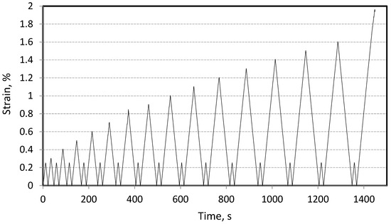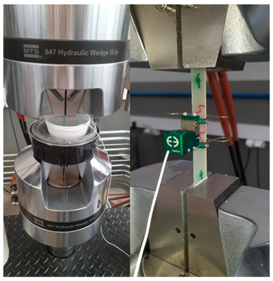 Tensile tests were performed using an Instron 8502 ServoHydraulic Fatigue Testing Systems equipped with a 250 kN load cell and hydraulic grips. Axial strains were measured using a standard dynamic Epsilon 3442-LT Axial Extensometer (Epsilon Technology Corporation, Logan, UT, USA) with a 20 mm base, positioned in the middle of the sample’s gauge length. Due to practical limitations, only three specimens for each test were used to obtain the presented results. Undesired loads resulting from the contraction of the specimens and the equipment parts during chamber cooling were compensated until thermal equilibrium was reached. The tests were conducted in the displacement control mode at a rate of 2 mm/min. The modulus was determined from stress–strain curves within a linear range from 0.005% to 0.002% strain. In the cyclic loading–unloading tests (L–UL), the samples underwent steps of increasing strain, starting from 0.25% until failure (or up to a maximum strain of 1.60%). After each loading step, the samples were unloaded to 15 N, the axial strains were zeroed, and a low-level (up to 0.25%) L–UL step was performed, from which the modulus was determined. The tests were conducted in accordance with ASTM D3039 standards [32]. Figure 2 shows the schematic representation of the load progression up to 1.6%, followed by an increase in load until the sample failure. Figure 3 shows the clamping of the samples along with the extensometer used.