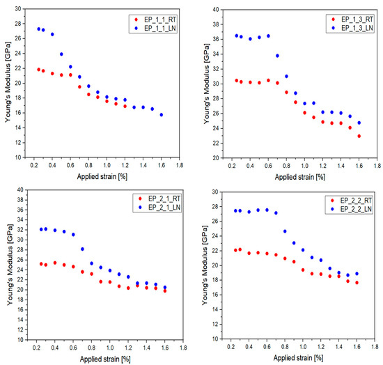 Comparing the above-described materials, which have the same type of resin (YDPN) but different hardeners (Novolac P and DDS), it can be observed that the degradation of Young′s modulus at RT is similar. However, in LN2, the situation is different—for EP_1_1, it is around 34%, whereas for EP_1_3, the degradation is slightly lower at around 25%. Materials using the YD-128 epoxy resin exhibit poorer mechanical properties—the Young′s modulus of both materials at RT is below 25 GPa. In cryogenic conditions, it is close to 30 GPa, which results in a significant disparity between RT and LN2.