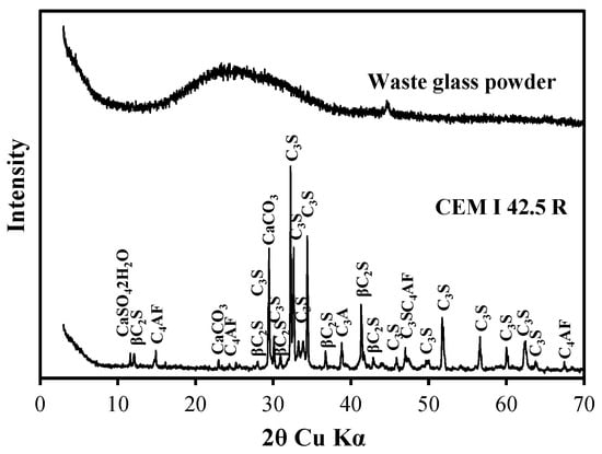 XRD patterns of unhydrated Portland cement (CEM I 42.5 R) and waste glass powder.