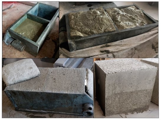 The prepared mixture exhibited a slurry consistency similar to self-compacting concrete, facilitating seamless pouring into molds (Figure 4). Samples were left to cure for 24 h before demolding. Some samples were subjected to curing for 28 days at 20 °C and 40–60% RH; some samples, after demolding, were submerged into prepared liquid glass and allowed under negative vacuum (−100 bar) to soak for 30 min; after that, kept with the rest of the samples. The dimensions of all samples cast for the experiments were 100 × 100 × 100 mm. As no additional sand or coarse aggregates were used in the concrete samples, the same crushed specimens were prepared for other analyses, including X-ray Diffraction (XRD) and Scanning Electron Microscopy (SEM). The notations for the binder used in the XRD analysis and the prepared concrete samples are consolidated in Table 3. Different compositions of aluminum-based ultra-lightweight concrete analyzed in the research are shown in Table 4.