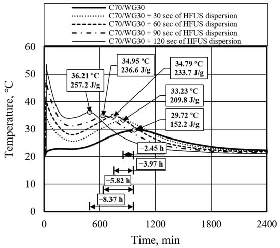 Applying HFUS dispersion to the mixtures with 30% waste glass powder substitution introduced a positive shift in the hydration dynamics. HFUS dispersion effectively accelerated the hydration process, reducing the final setting time from 988 to 486 min over the dispersion period ranging from 0 to 120 s. This acceleration can be attributed to the cavitation effects induced by ultrasonic waves, which promote binder particles’ deagglomeration and enhance their reactivity. The dispersion not only improved the hydration kinetics but also resulted in a slight increase in compressive strength from 2.8 MPa to 3.1 MPa, counteracting the initial strength reduction caused by the inclusion of waste glass powder.