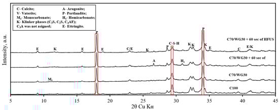 Quantitative XRD analysis via Rietveld refinement provided detailed insight into the mineral phase (Table 6). In the reference mixture (C100), the amorphous phase constituted 46.0%. Substituting 30% of Portland cement with waste glass powder (C70/WG30) increased the amorphous phase to 54.5%. This increase is attributed to the higher waste glass powder content and calcium silicate hydrate formation (C-S-H). During the hydration process, the tricalcium silicate (C3S) and dicalcium silicate (C2S) phases primarily contribute to the formation of calcium silicate hydrate (C-S-H), which is a crucial component affecting the mechanical properties of concrete. Samples subjected to HFUS and liquid glass treatments exhibited similar amorphous phase levels.