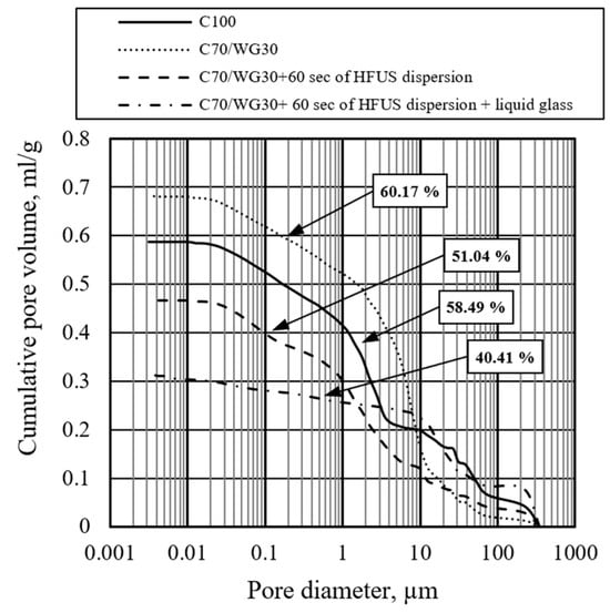 The mercury intrusion porosimetry test method was employed to evaluate the effects of waste glass powder, high-frequency ultrasonic dispersion, and liquid glass on pore size distribution. Pore sizes across all four tested compositions ranged from 4.8 nm to 351.8 µm, likely due to the device’s measurement limits. The total capillary porosity in the reference mixture (C100) was 58.49% (Figure 8).