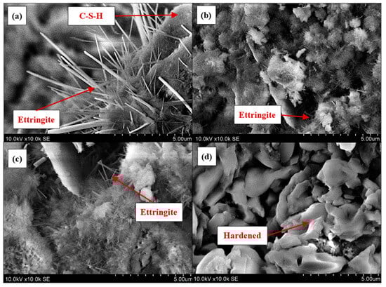 The results indicate that substituting a portion of Portland cement with waste glass powder increased portlandite. Each additional method (HFUS and liquid glass) further increased portlandite content. Elevated portlandite levels favorably increased the pH value of the cement paste’s pore solution. A highly alkaline environment not only helps dissolve waste glass powder but also enables amorphous SiO2 from the glass powder to react with portlandite, forming low-basicity calcium silicate hydrate, which enhances the microstructure and mechanical properties of the concrete. Similar trends were observed with ettringite. However, ettringite tends to form in already existing voids and thus does not significantly impact mechanical properties.