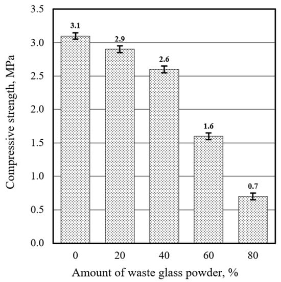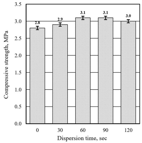 However, substituting 30% of Portland cement with waste glass powder (C70/WG30) and applying high-frequency ultrasonic (HFUS) dispersion for 30 to 90 s slightly increased compressive strength from 2.8 MPa to 3.1 MPa. Prolonging the HFUS dispersion to 120 s caused a minor decrease in compressive strength (Figure 12). This enhancement in compressive strength can be attributed to the synergistic effects of HFUS dispersion, which facilitates the deagglomeration and disintegration of binder particles, thereby accelerating the hydration processes of Portland cement and waste glass powder.
