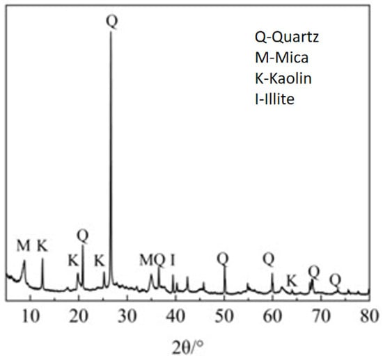 The coal gangue is taken from the Fengfeng mine in Handan, Hebei, and the coal gangue used is the raw coal gangue randomly sampled from the outer layer of the gangue mountain. Its chemical composition is shown in Table 1; it can be seen that the main chemical composition of the original coal gangue is SiO2, Al2O3, and Fe2O3. The industrial analysis is shown in Table 2, which shows that raw coal gangue belongs to the category of low heat generation and less carbon coal gangue. The XRD pattern of coal gangue is shown in Figure 1; the main minerals in the original coal gangue are kaolin, mica, quartz, and illite. The alkaline activator will destroy the kaolin and mica in the coal gangue, the diffraction summit will be deflected to decrease, and the kaolin will gradually transform into zeolite-like.