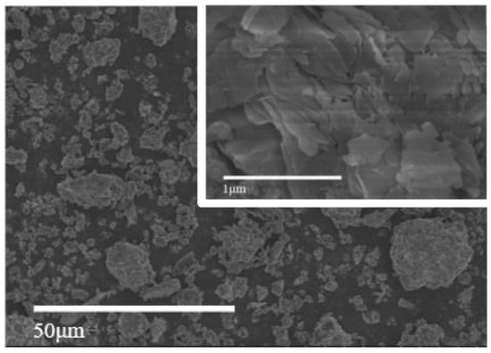 Firstly, the raw coal gangue is crushed into coarse aggregate by using a jaw crusher, then crushed into fine aggregate by using a sand-making machine, and finally milled by using a vertical planetary ball mill for 40 min and passed through 120 mesh square hole sieve for spare. The microphotograph of coal gangue powder is shown in Figure 2; after the coal gangue is ball-milled, there is a certain gradation between the particles, which is dominated by lamellar and irregular elliptic shapes, with some sharp angular particles with lamellar texture. The particle size distribution is shown in Figure 3.