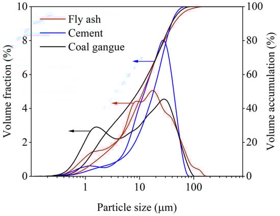 Fly ash is class II fly ash provided by Jinfu Base Co., Ltd. (Fuxin, China). The main chemical composition is SiO2 and Al2O3; the apparent density is 2200 kg/m3, and the specific surface area is 652 m2/kg. Its chemical composition is shown in Table 1; the content of CaO is less than 10%, which is a low-calcium fly ash. Its chemical composition is shown in Table 1, and the distribution of the particle size is shown in Figure 3.