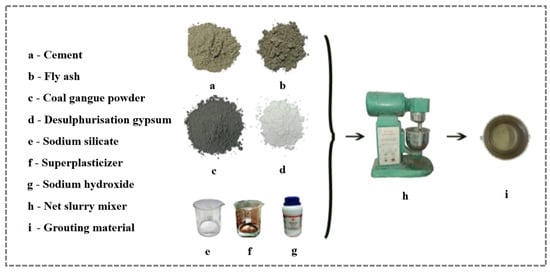 Relevant studies and a large number of previous experiments by the group show that the compounding of coal gangue, fly ash, slag, and ordinary silicate cement will give play to the comprehensive advantages of the close packing of the particles of multiple materials and calcium silica-aluminum coordination, which is more conducive to the development of the rheology, strength, and durability of the geopolymer [17,31,32]. The type and content of the activator ligand play a key role in the polymerization reaction. In view of this, in this paper, a new type of green, low-carbon, and low-cost grouting material, CGGM, is synergistically prepared by using coal gangue, fly ash, and ordinary silicate cement as the main raw materials, alkali silicate solution as the alkaline activator, and desulfurization gypsum as the sulfate activator.