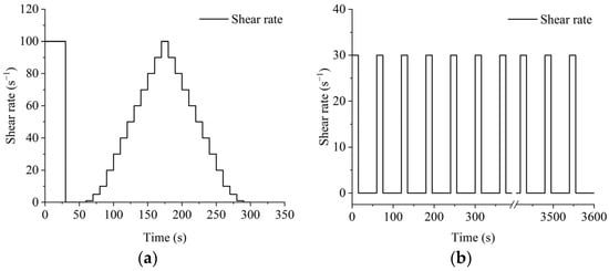 Procedure 1: Immediately after the slurry was stirred and poured into the sample cup, it was left to stand for 30 s so that the rotor was immersed and centered in the slurry, and then it was left to stand again for 30 s before starting the measurement. A pre-shear of 30 s at a shear rate of 100 s−1 was used first, followed by a resting period of 30 s, after which the shear rate was first increased from 0 to 100 s−1 and finally reduced from 100 s−1 to 0 again.
