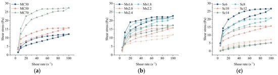 Rheology and flow pattern curve of CGGM slurry: (a) different coal gangue content; (b) different sodium silicate modulus; (c) different sodium silicate content.
