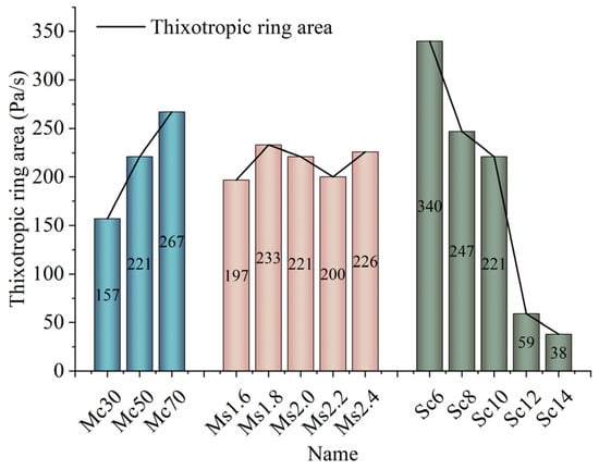 Thixotropic ring refers to the rheological test; the sample to be tested by the shear rate gradually increased and then reduced by the upper and lower two shear stress flow curves back to the loop (see Figure 6 for details), the two curves enveloped by the area that is the thixotropic ring area. The thixotropic ring area results are shown in Figure 7. The thixotropic ring area reflects the size of the thixotropic energy storage, that is, the difference between the energy required for structure disintegration and the energy required for structure formation in the slurry. The larger the thixotropic ring area, the better the thixotropy. The slurry contains a large number of flocculated structures at a lower shear rate; the destruction of these flocculated structures requires higher shear stress, part of the flocculated structure is destroyed in the rising stage, the existence of a large number of freely suspended particles and tiny flocculated structures in the slurry reduces the required shear stress for the destruction of the tiny flocculated structures, so that in the descending section of the shear stress is less than the ascending stage. The thixotropy of the CCGM slurry is shown as follows: shear thinning, with the disappearance of external force, gradually thickens to condensation hardening. In the actual grouting process, when the slurry reaches the reinforced position, the grouting pressure gradually disappears, and the slurry becomes static and thickened, which is conducive to the retention and coagulation of the slurry, thus improving the effect of grouting and reinforcement [37]. The influence of each factor on the slurry is, in order, sodium silicate content, coal gangue content, and sodium silicate modulus.