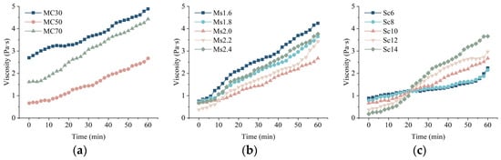 Time-varying curve of viscosity of CGGM slurry: (a) different coal gangue content; (b) different sodium silicate modulus; (c) different sodium silicate content.