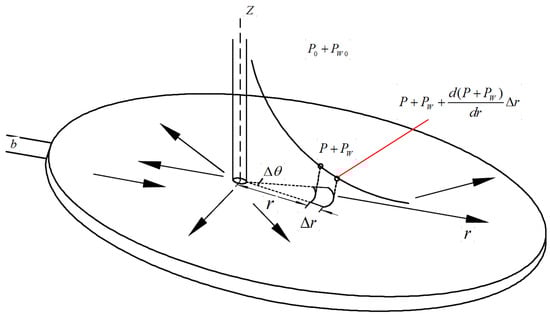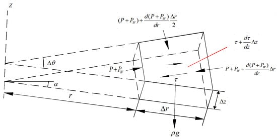 Based on the above assumptions, the inclined fissure can be simplified to a flat fissure that is straight, smooth, and infinitely extended. When grouting in the coal seam bottom plate, the grouting holes and fissures present the relationship of oblique intersection, vertical and parallel, among which the vertical and oblique intersection of fissures is more important for the prevention and control of the bottom plate water breakout. Therefore, the state of slurry grouting holes and fissures diagonally intersected is used for the analysis, assuming that the slurry is injected into the fissure from the grouting holes under the action of grouting pressure to flow in the plane radial parallel to the fissure surface, the grouting pressure in the grouting holes is P0, and the scouring force on the slurry caused by the flow of water is Pw, and the schematic diagram of slurry diffusion in the inclined fissure is shown in Figure 9, and the force analysis of any one micrometamer is carried out from Figure 9 [40] as shown in Figure 10, and the force analysis is carried out in Figure 10 if Neglecting the static shear force generated by the water flow on the slurry and not considering the effect of the velocity change, the sum of each component force along the radial direction of the microelement body is equal to 0.