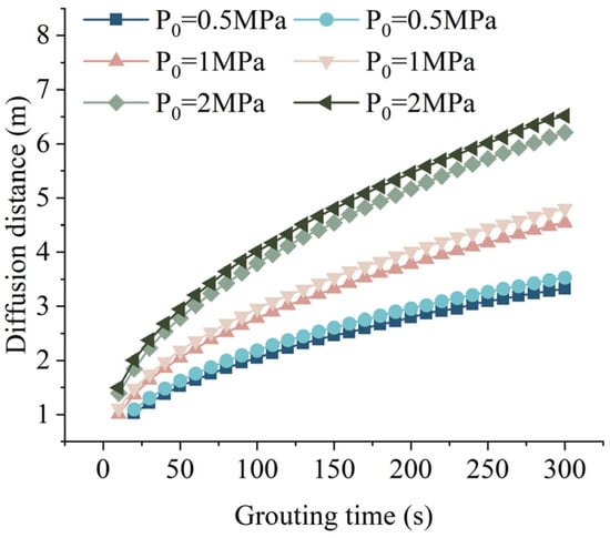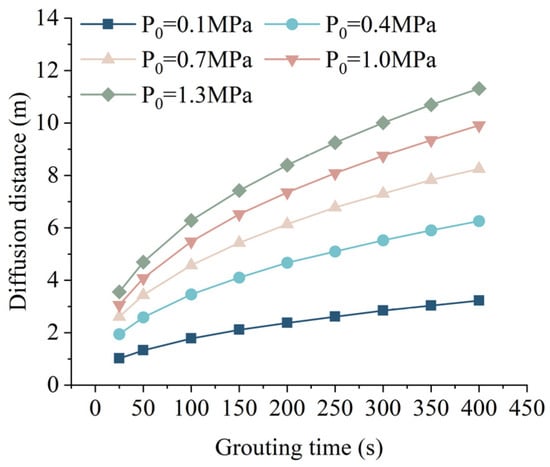 Relationship between grouting time and grouting diffusion distance under different grouting pressures.