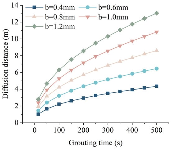Relationship between grouting time and grouting diffusion distance under different fissure widths.