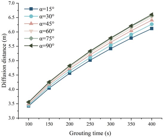 When hydrostatic pressure Pc = 0.1 MPa, grouting pressure P0 = 0.5 MPa, and fissure inclination angle α = 30°, the relationship between grouting time and slurry diffusion distance under different fissure widths is shown in Figure 12, from Figure 12, it can be seen that, when the grouting time is the same, the larger the fissure width is, the larger the grouting diffusion distance of the slurry is. Therefore, under other conditions, the fissure width is positively correlated with the slurry diffusion distance, i.e., the larger the fissure width is, the larger the slurry diffusion distance is. However, the time required to reach the ultimate diffusion distance will be prolonged with the increase of the fissure width. Originating from the diffusion process, the slurry in the unreacted particles of the existence of deposition results in fissure blockage, reducing the diffusion capacity of the grouting slurry. The study of Zhao et al. [42] divided the horizontal hole grouting in fissure aquifer into three time periods, i.e., filling grouting, boosting penetration grouting, and high-pressure spreading grouting, in the actual grouting process, low-pressure grouting should be used in the preliminary grouting process to prevent the slurry from exceeding the design diffusion range and high-pressure splitting grouting are suitable to be used to achieve the spreading of closed fissures or micro tensioned fissures to be filled after the boosting grouting [22].