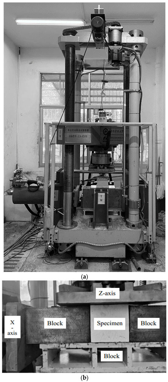 The experiment employed a self-developed CX-8568 impact-disturbance surrounding rock test system, as shown in Figure 1a. This system is capable of performing single or combined loading in three directions, including static loading and unloading, dynamic disturbance, and impact testing on large-sized specimens. In this study, stress in the Z-axis direction is denoted as σ1, and stress in the X-axis direction as σ2, with the amplitude of the disturbance loads being σs. The strain is measured by the built-in spring displacement meter. The specimens were placed on the x–y plane of the test rig, as shown in Figure 1b. Lubricant was applied to the specimens’ surface to minimize friction between the pressure plate and the specimens.