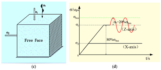 - Using 80% of the σbcs under each lateral pressure as the average stress σ1 for cyclic disturbance loads, and 20% of σbcs as the amplitude σs of the disturbance loads, performing cyclic disturbance tests until specimen failure. The specific steps for the cyclic disturbance test involve applying loads along the X-axis and Z-axis at a rate of 1 kN/s, maintaining the preset lateral pressure σ2 on the X-axis, loading the Z-axis to the preset average cyclic disturbance stress σ1, and then subjecting the specimen to disturbance loads until failure with a sine-wave disturbance waveform at a frequency of 2 Hz. The failure process is recorded using a camera. Figure 1c,d are the compression diagram and stress path diagram of the specimen, respectively.