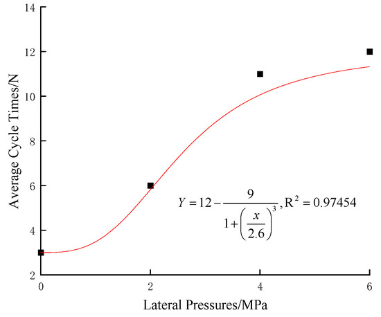 Table 2 presents the cycle counts to failure for gypsum specimens under various lateral pressures when subjected to disturbance loads. Figure 2 is the relationship between the average cycle counts and the lateral pressure. Observations from Table 2 indicate that gypsum specimens exhibit the fewest cycle counts to failure at a lateral pressure of 0 MPa. As lateral pressure increases, there is a corresponding increase in the average cycle counts to failure, suggesting that lateral pressure can enhance the rock’s capacity to withstand fatigue loads. In Figure 2, for each increment of 2 MPa in lateral pressure, the multiplicative increase in the average cycle counts to failure for the gypsum specimens shows a successive decline, with factors of 2.2, 1.8, and 1.1, respectively. This trend mirrors that observed in the literature, underscoring that the rock’s fatigue resistance does not improve linearly with increasing lateral pressure; instead [27,32], it plateaus at a certain threshold. This observation implies that there is a definitive upper limit to the enhancing effect of lateral pressure on the rock’s fatigue resistance.
