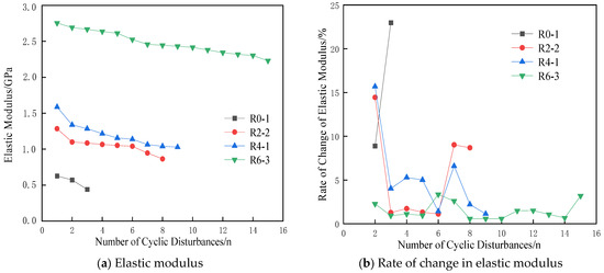 Figure 5 presents the curve of the elastic modulus and the change rate of the elastic modulus of the specimens during cyclic disturbance. As shown in Figure 5a, under the same lateral pressure, the specimens’ resistance to deformation decreases with an increase in the number of cyclic disturbances, which is reflected by the decrease in the elastic modulus. Additionally, for the same number of cyclic disturbances, a higher lateral pressure results in a greater elastic modulus, indicating a stronger ability to resist deformation.