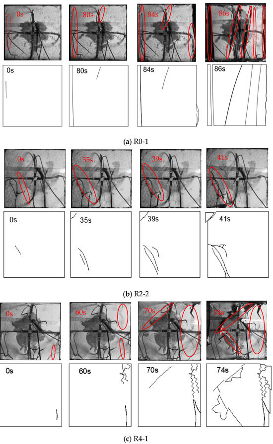 In Figure 6a, specimen R0-1 initially exhibits a small tensile crack on the left side. At 80 s, this crack extends to the upper and lower sides, and a tensile–shear crack forms in the middle and upper parts, approximately parallel to the axial direction. By 84 s, the left side is nearly fractured, and the right side is extruded as the disturbance loads commence. At 86 s, the tensile–shear crack in the middle expands rapidly, accompanied by two parallel cracks, leading to specimen destruction as both sides detach.