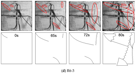 In Figure 6c, specimen R4-2 first shows a short tensile crack in the lower right corner. After 60 s, the crack bulges in the upper-right corner. At 70 s, tensile cracks on the right side connect, and an oblique downward shear crack appears in the middle and upper parts. The disturbance loads then begin. At 74 s, the right area is severely extruded and peeled off, and the shear crack spreads, connecting with another in the middle and lower part, ultimately causing specimen destruction.