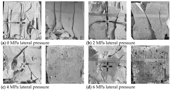 Failure characteristics of gypsum specimens with different lateral pressures.