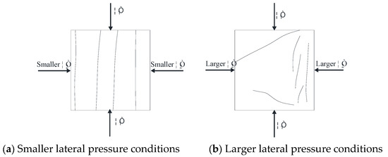 Camera recordings of the compression deformation process have enabled detailed observations of crack appearance, development, and penetration on the specimen surfaces, facilitating the analysis of crack evolution and failure characteristics under different lateral pressures. To illustrate the crack propagation process, especially with the presence of strain gauges, a corresponding sketch has been created as shown in Figure 6.