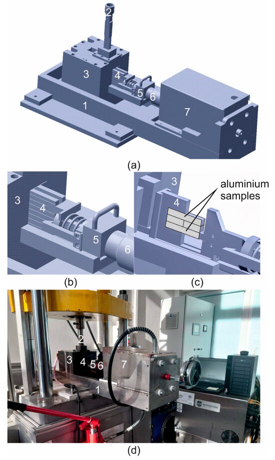 Device for predicting the seam weld quality of extrudates: 3D model (a–c) and laboratory device (d). The numbers represent the following: 1—main construction ram; 2—upper shearing punch; 3—heating cell; 4—welding cartridge tool; 5—adapter; 6 –hydraulically driven stem; 7—hydraulic cylinder (Patent No PL243256B1, AGH Krakow, 2022 [30]).