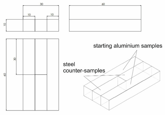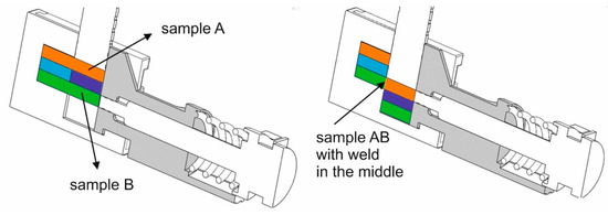 The initial sample dimensions were of 60 × 10 × 5 mm (Figure 2 left). The key dimensions are shown in Figure 3. We placed one aluminium specimen, specimen ‘A’, on top in the cassette and the other, ‘B’, on the bottom. Between sample ‘A’ and ‘B’, we placed the counter samples (left and right). During the test, the toolbox (4) was pushed into the heating cell (3), the top punch (2) was driven to make contact, and the specimens were compressed with a force of 500 kG by the side punch equipped with a spring pressure system (5). After heating the specimens to the specified temperature (with the time depending on the set temperature), the top punch (2) cut specimens ‘A’ and ‘B’ by displacing the right side with the right counter punch by a distance of 20 mm, thus obtaining one specimen, ‘AB’, and two halves of specimens ‘A’ and ‘B’ (Figure 2 right). The newly created specimen, ‘AB’, which had the left side of specimen ‘B’ and the right side of specimen ‘A’ in its structure, was compressed with a side punch (5). After the test, the new two-piece specimen, ‘AB’, was prepared into a 6 mm diameter base sample with a length of 60 mm and subjected to a tensile test (Figure 4).