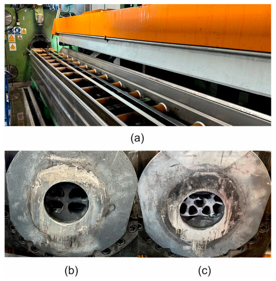 The run-out table of the 25 MN 7-inch extrusion press (a) and porthole dies of different constructions: the porthole die for the production of the tube measuring Ø 60 × 3 mm from alloy 1A (b), and the porthole die for the production of the profile measuring 40 × 40 × 3 mm from alloy 3A (c).