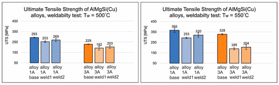 Influence of welding temperature on the ultimate tensile strength, UTS, of samples after the weldability testing of AlMgSi(Cu) alloys 1A and 3A: welding temperature of 500 °C (left) and welding temperature of 550 °C (right).
