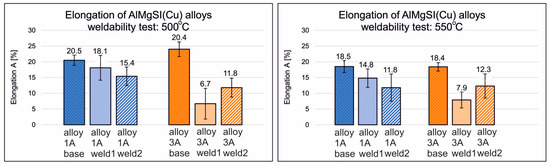 Influence of welding temperature on the elongation A of samples after the weldability testing of AlMgSi(Cu) alloys 1A and 3A: welding temperature of 500 °C (left) and welding temperature of 550 °C (right).