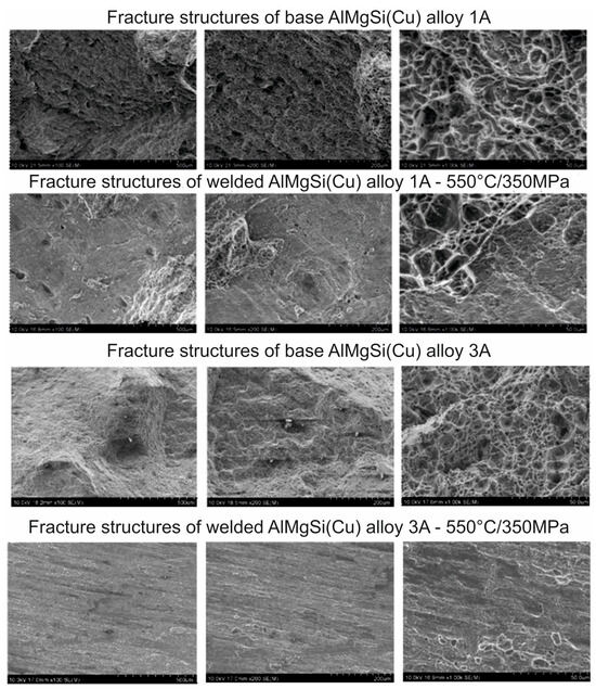 Regarding the ductility of the welded samples, very-high-percentage elongation was obtained for AlMgSi(Cu) alloy 1/1A under welding temperatures of 500 and 550 °C, which indicates an already well-plasticised joint (Figure 9). For a welding temperature of 550 °C, elongation values of 12–15% were obtained for alloy 1/1A and 8.5–12% for alloy 6/3A. This is confirmed by the results of fractographic studies of the welded specimens in relation to the base specimens, where for the aforementioned welding conditions for individual alloys from 1/1A to 6/3A, fractures with a ductile character or that were predominantly ductile as well as brittle were observed (Figure 10). The fractures of the base (aged) specimens, regardless of the heat treatment conditions used, were transcrystalline plastic in nature, characterised by the occurrence of numerous dimples and hills. In the case of alloy 1/1A, a plastic fracture was observed, and for alloy 6/3A, after the welding process, for some process conditions, the fractures were characterised by low surface development, which may be indicative of poor bonding during the welding process.
