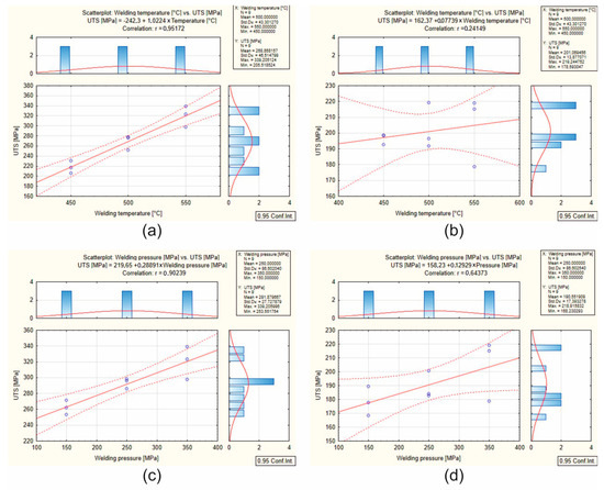 Scatter plots for the weldability test: UTS for AlMgSi(Cu) alloys no 1A (a,c) and 3A (b,d)—(a) correlation of UTS–welding temperature (450 °C, 500 °C and 550 °C) for alloy 1A; (b) correlation of UTS–welding temperature (450 °C, 500 °C and 550 °C) for alloy 3A; (c) correlation of UTS–welding pressure (150 MPa, 250 MPa and 350 MPa) for alloy 1A; (d) corelation of UTS–welding pressure (150 MPa, 250 MPa and 350 MPa) for alloy 3A (dotted lines are border lines and solid lines are medium lines).