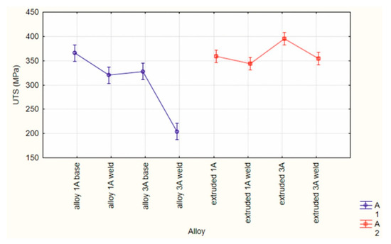 An ANOVA statistical analysis was also carried out for welded and unwelded samples of AlMgSi(Cu) alloys numbered 1A and 3A in the weldability test and the industrial extrusion test (Figure 12). In the graph shown, it can be seen that slightly higher UTS values were obtained in the extrusion test, and at the same time, similar values were obtained for the samples in the welding area and outside the weld. In the weldability tests, a significantly lower UTS was observed for the welded sample compared to the non-welded sample for alloy 3A. This may indicate insufficient precipitation of the alloy during its release from the tool cassette during the weldability tests, which later translated into much lower UTS values of the samples after final artificial ageing.