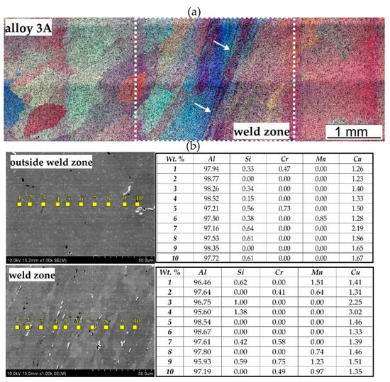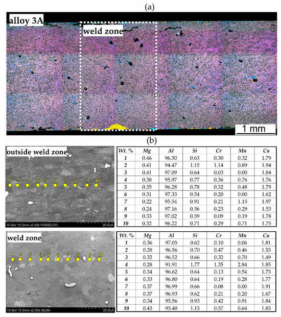 The microstructure of alloy 3A exhibits significant variation between the areas outside the weld zone and the weld zone itself. The microstructure outside the weld zone features a coarser grain structure that appears more equiaxed and randomly oriented. In contrast, the weld zone reveals a more elongated and refined grain structure (Figure 12). Figure 11b displays the microstructure analysed by SEM along with point chemical composition analysis using energy-dispersive spectroscopy (EDS), expressed in weight percent. The accompanying table lists the elemental contents: Mg, Al, Si, Ti, Cr, Mn, Fe, Cu, Zn, and Zr. Outside the weld zone, the microstructure is more homogeneous. The aluminium (Al) content remains high and consistent across the measured points, ranging from 97.16% to 98.77%. The amount of silicon (Si) is generally low but noticeable, with values reaching up to 0.64%. Copper (Cu) levels are relatively higher in some areas, such as 1.40% and 2.19%. Manganese (Mn) is also present in notable amounts, with values ranging from 0.85% to 1.86%. The chromium (Cr) and silicon (Si) contents are relatively low, though Cr shows a slight increase toward the weld zone boundary. In the weld zone, the aluminium (Al) content is slightly reduced compared to that in the outside zone, varying from 95.60% to 97.61%. Silicon (Si) displays a significant increase at certain points, reaching up to 1.38%, likely indicating a localised increase due to welding effects. The copper (Cu) content remains high, reaching up to 1.51% in some regions, suggesting a concentration shift within the weld zone. Manganese (Mn) values also increase within the weld zone, reaching up to 1.51%, and indicating that the welding process may have caused a redistribution of Mn across the weld interface.