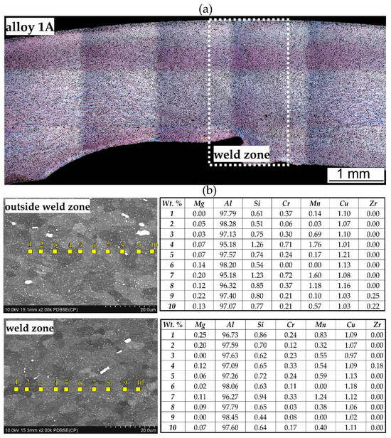 Microstructure of the laboratory-welded 1A alloy, with welding at T = 550 °C and p = 350 MPa: (a) cross-section through the sample, LM; (b) results of the chemical composition analysis on the grain cross-section, SEM/EDS.