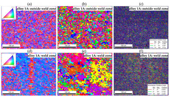EBSD analysis of the extruded profile: alloy 1A (a–c) outside weld the zone area, and (d–f) in the weld zone; (a,d) EBSD maps showing changes in orientation (IPF); (b,e) EBSD maps showing grains in the microstructure (grain contrast); (c,f) maps showing the types of grain boundaries (the boundaries with a large angle are marked in blue, and the boundaries with a small angle are marked in red and green).