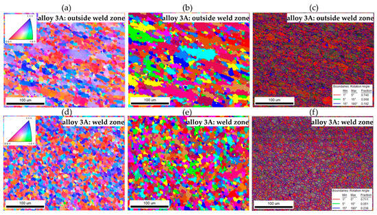 EBSD analysis of the extruded profile; alloy 3A (a–c) outside the weld zone area and (d–f) in the weld zone; (a,d) EBSD maps showing changes in orientation (IPF); (b,e) EBSD maps showing grains in the microstructure (grain contrast); (c,f) maps showing the types of grain boundaries (the boundaries with a large angle are marked in blue, and the boundaries with a small angle are marked in red and green).